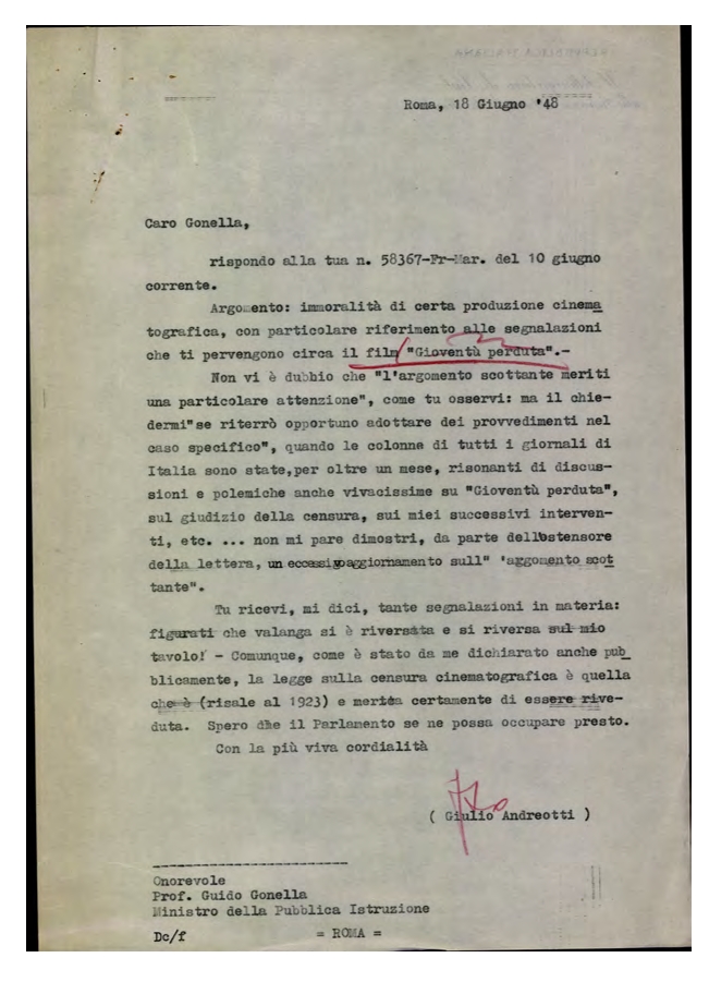 Giulio Andreotti risponde a Guido Gonella sul film "Gioventù perduta" di Pietro Germi e a proposito della legge sulla censura cinematografica. Dattiloscritto