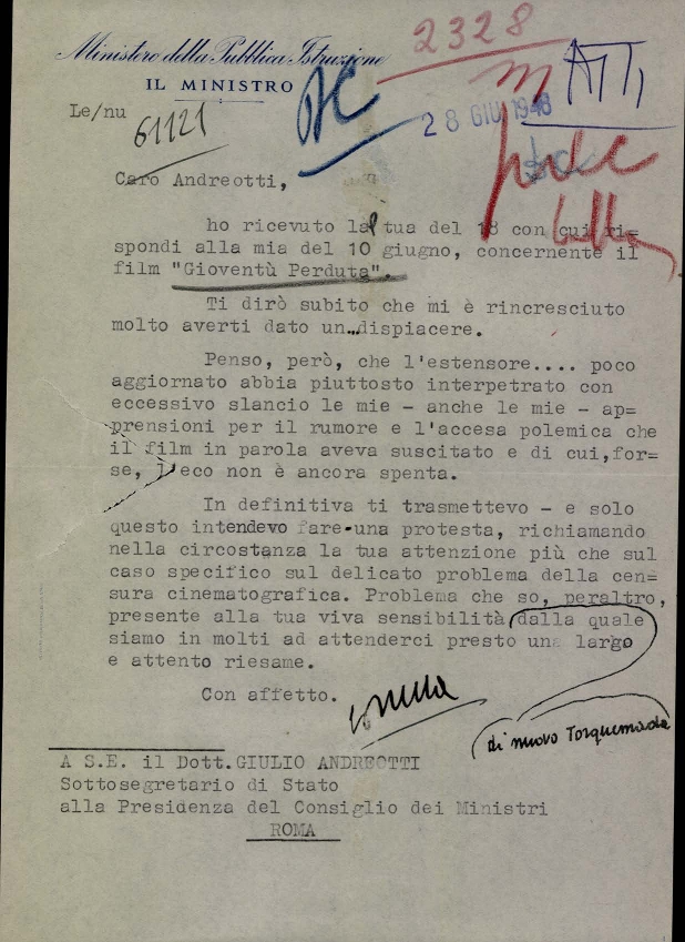 Guido Gonella scrive a Giulio Andreotti a proposito delle polemiche sul film "Gioventù perduta" di Pietro Germi e della censura cinematografica. Dattiloscritto