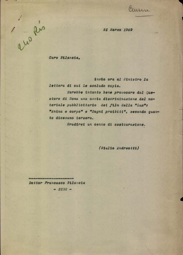 Giulio Andreotti segnala a Francesco Bilancia l'opportunità di censurare il materiale pubblicitario dei film della Lux "Anima e corpo" e "Sogni proibiti". Dattiloscritto