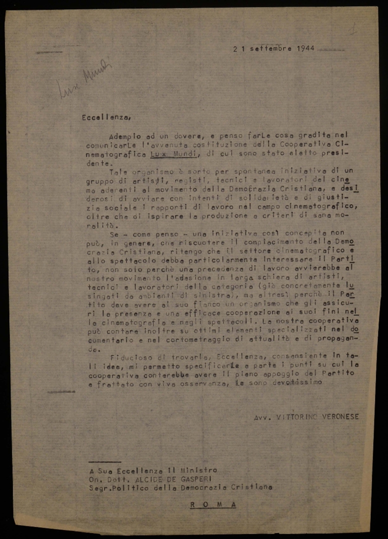 Lettera di Vittorino Veronese, presidente della cooperativa cinematografica "Lux Mundi", al ministro Alcide De Gasperi, segretario politico della Democrazia Cristiana