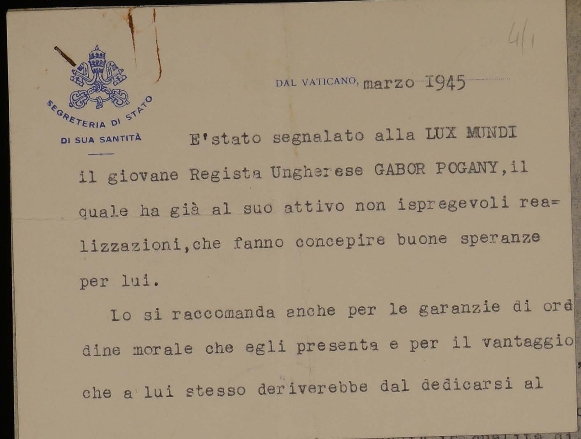 Segnalazione alla Lux Mundi del regista ungherese Gábor Pogány. Dattiloscritto