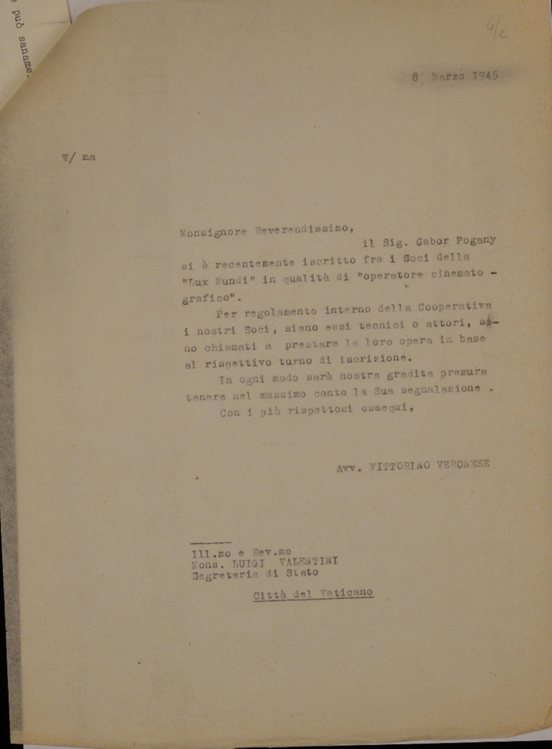 Lettera di Vittorino Veronese, presidente della cooperativa cinematografica "Lux Mundi", a mons. Luigi Valentini, della Segreteria di Stato di Sua Santità