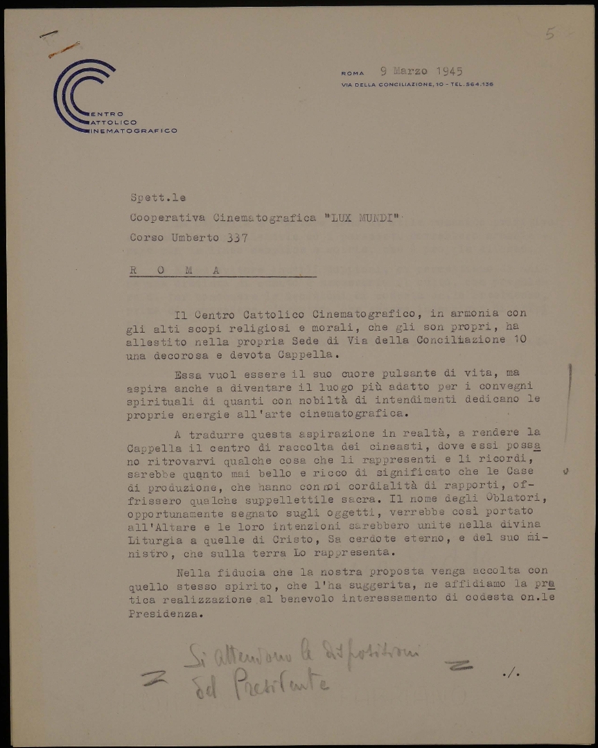 Lettera di Luigi Gedda, presidente del Centro cattolico cinematografico - CCC, alla cooperativa cinematografica "Lux Mundi"