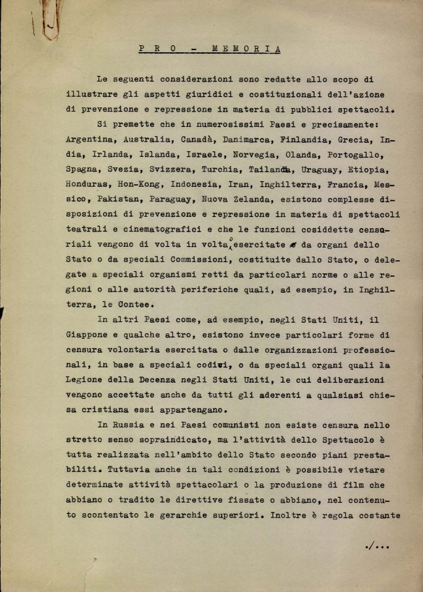 Considerazioni sugli aspetti giuridici e costituzionali dell'azione di prevenzione e repressione in materia di pubblici spettacoli. Dattiloscritto