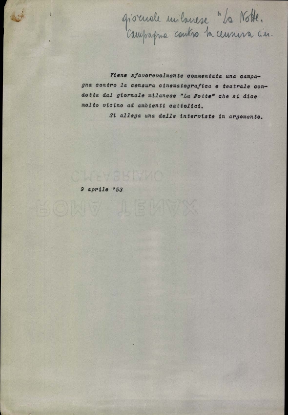 Segnalazione della campagna contro la censura cinematografica e teatrale condotta dal giornale milanese "La Notte" vicino ad ambienti cattolici. Dattiloscritto