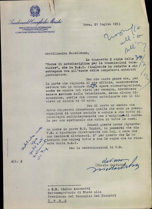 Lettera di Nicola De Pirro, direttore generale dello spettacolo, all'on. Giulio Andreotti, sottosegretario di Stato alla presidenza del consiglio dei ministri
