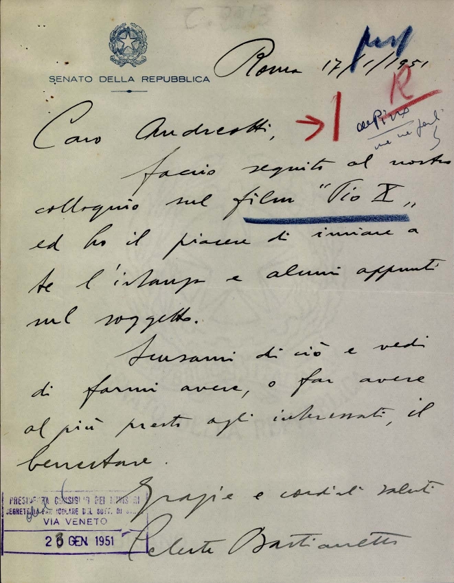 Celeste Bastianetto scrive a Giulio Andreotti a proposito del film su Pio X. Manoscritto