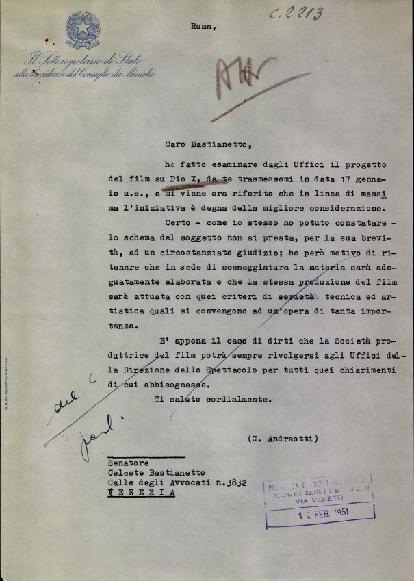 Giulio Andreotti risponde a Celeste Bastianetto a proposito del progetto cinematografico su Pio X. Dattiloscritto