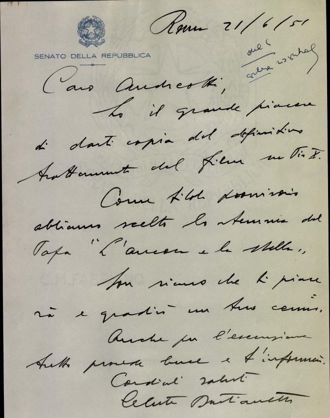 Celeste Bastianetto invia a Giulio Andreotti aggiornamenti sul film dedicato alla vita di Pio X. Manoscritto