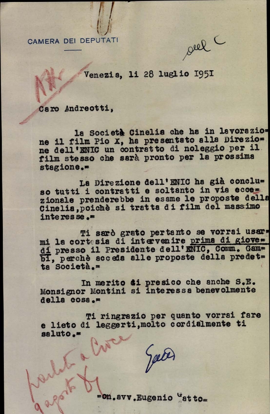 Eugenio Gatto scrive a Giulio Andreotti in merito ai rapporti della casa cinematografica Cinelia con l'Ente nazionale industrie cinematografiche - ENIC per la realizzazione del film su Pio X. Dattiloscritto