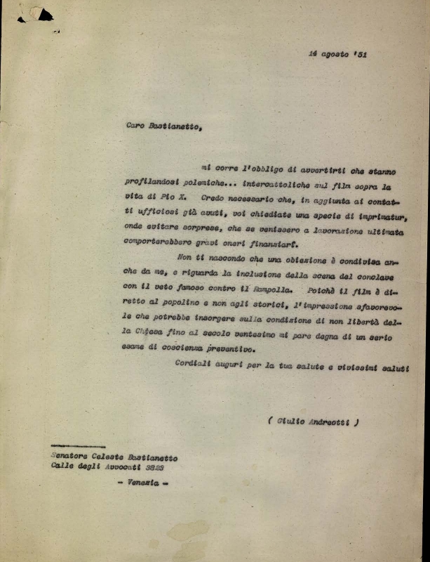 Giulio Andreotti richiama l'attenzione di Celeste Bastianetto su alcuni contenuti del film su Pio X. Dattiloscritto
