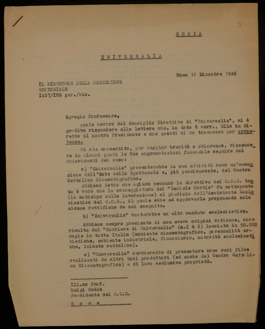 Lettera di Paolo Nicolaj, direttore della produzione editoriale della Universalia, a Luigi Gedda, presidente del Centro cattolico cinematografico - CCC