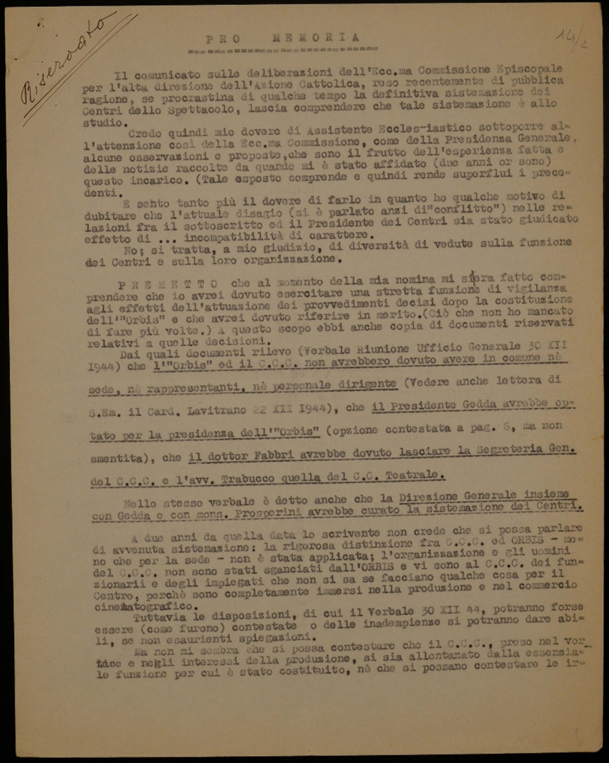 "Pro memoria" sulla sistemazione dei centri dello spettacolo