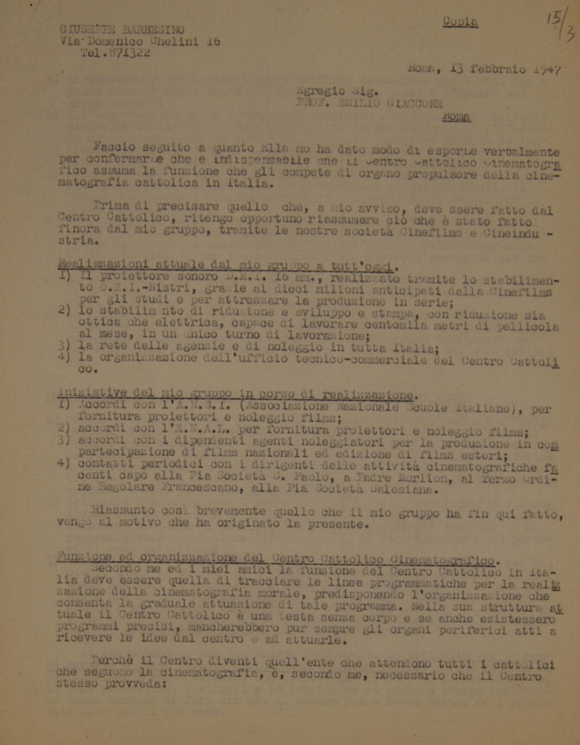 Giuseppe Barbesino scrive a Emilio Giaccone sulla necessità che il Centro cattolico cinematografico - CCC assuma la funzione di organo propulsore della cinematografia cattolica in Italia e invia osservazioni e suggerimenti affinché il Centro sia in grado di assumere tale responsabilità anche a livello periferico. Dattiloscritto