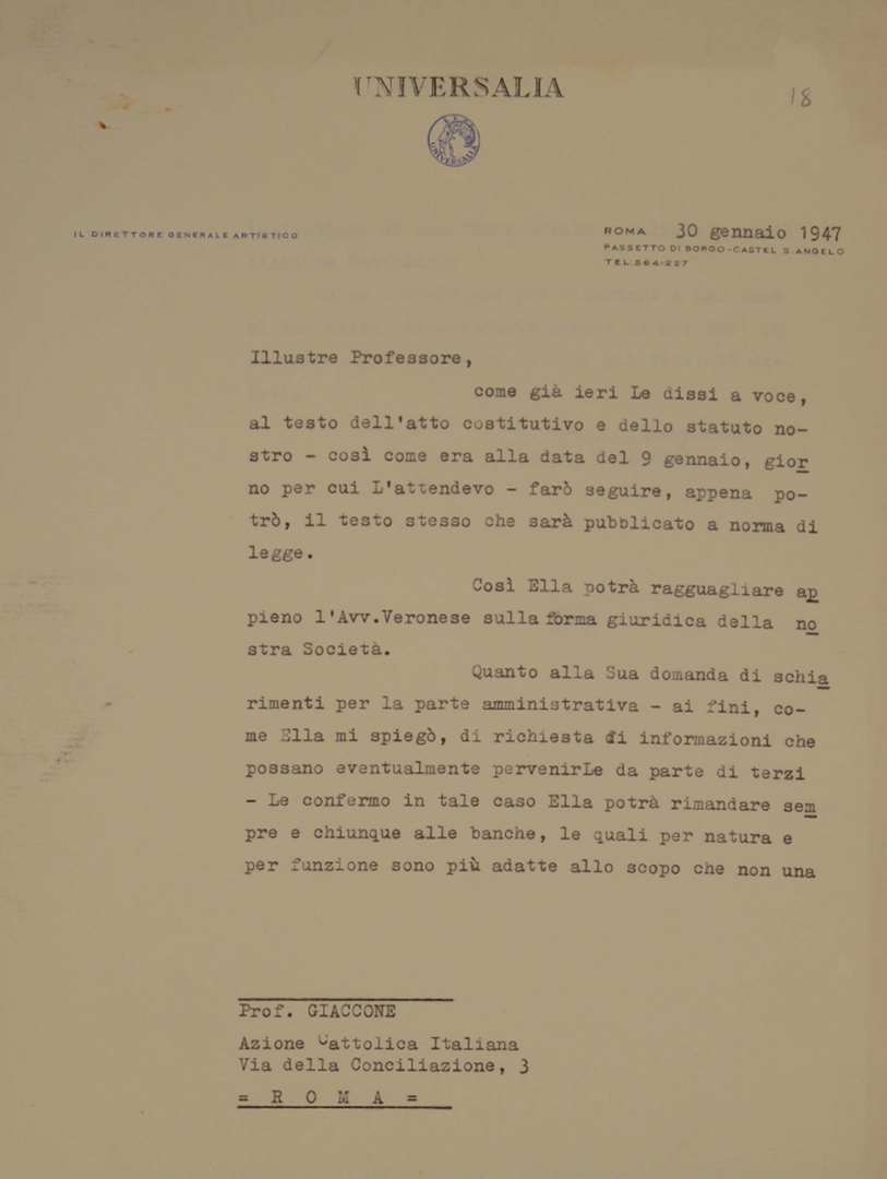 Lettera di Andrea Lazzarini, direttore generale artistico della società di produzione cinematografica Universalia, a Emilio Giaccone