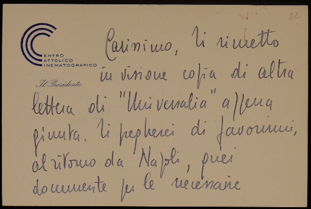 Lettera di Luigi Gedda, presidente del Centro cattolico cinematografico - CCC, a destinatario non indicato