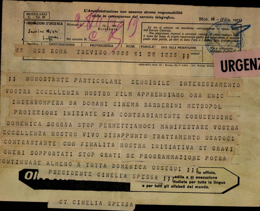 Telegramma del presidente della Cinelia Pietro Spessa all'on. Giulio Andreotti, sottosegretario di Stato alla presidenza del consiglio dei ministri