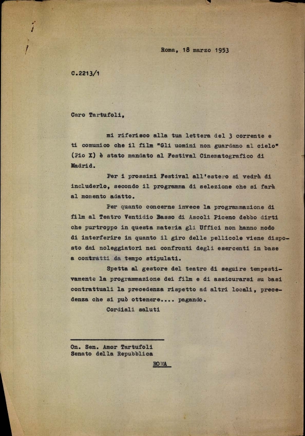 Giulio Andreotti comunica a Amor Tartufoli l'invio del film "Gli uomini non guardano il cielo" di Umberto Scarpelli al festival cinematografico di Madrid e conferma l'intenzione di inviare il film anche ad altre manifestazioni all'estero, mentre non assicura la proiezione ad Ascoli Piceno. Dattiloscritto