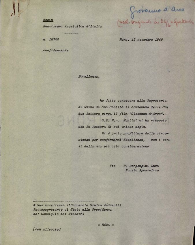 Francesco Borgongini Duca invia a Giulio Andreotti copia della lettera di mons. Giovanni Battista Montini, sostituto alla segreteria di Stato di Sua Santità , relativa al film "Giovanna d'Arco". Dattiloscritto