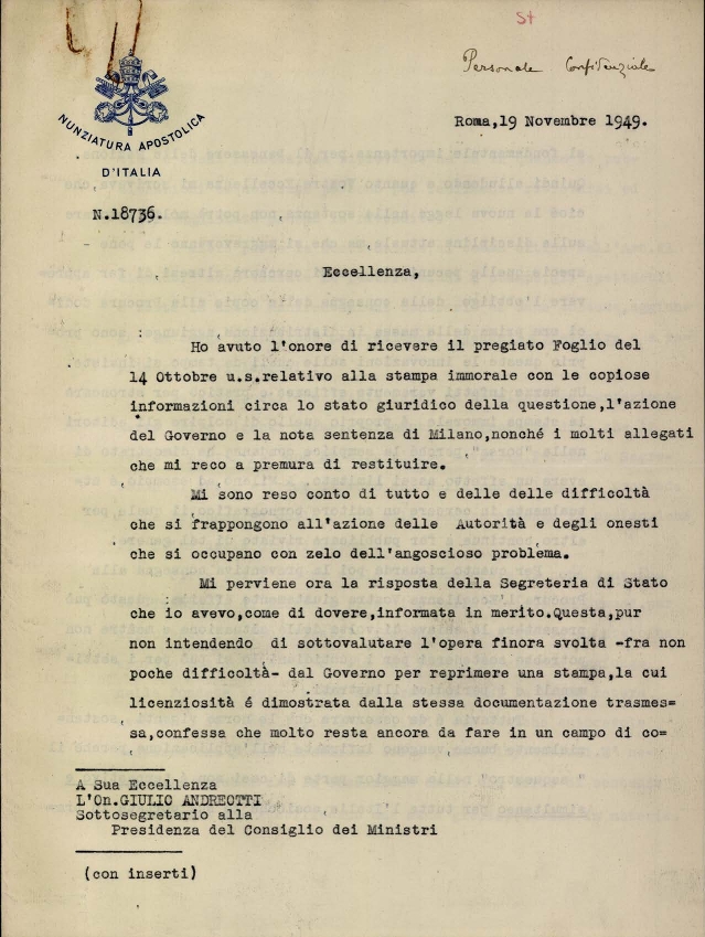 Francesco Borgongini Duca scrive a Giulio Andreotti sulla questione dello stato giuridico della stampa immorale e sulle procedure vigenti per la sua repressione da parte del governo. Dattiloscritto