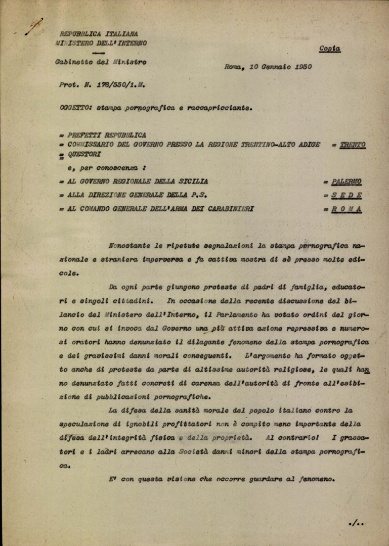 Disposizioni in merito alle misure da adottarsi per la repressione della stampa pornografica e immorale. Dattiloscritto