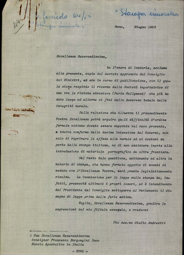Giulio Andreotti scrive a Francesco Borgongini Duca a proposito del provvedimento di divieto emanato dal governo contro la rivista straniera Paris Hollywood e più in generale sullo stato di avanzamento della legge sulla stampa. Dattiloscritto