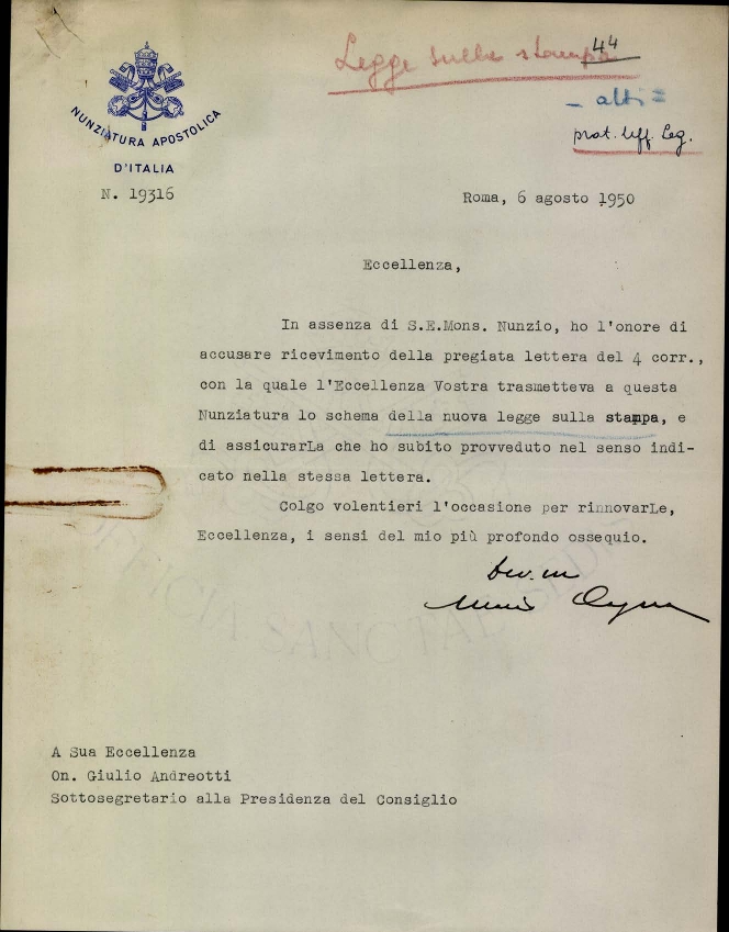 Lettera della Nunziatura apostolica d'Italia all'on. Giulio Andreotti, sottosegretario di Stato alla presidenza del consiglio dei ministri