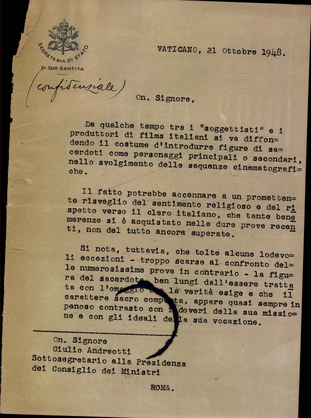 Mons. Giovanni Battista Montini segnala a Giulio Andreotti la diffusione di film e spettacoli teatrali che introducono figure di sacerdoti senza il dovuto rispetto per la pratica e la morale cristiana. Dattiloscritto