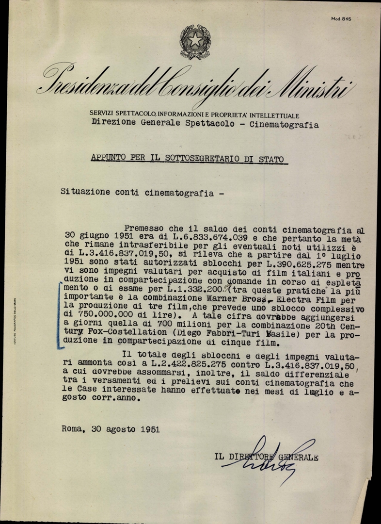 Sulla situazione dei conti della cinematografia. Dattiloscritto