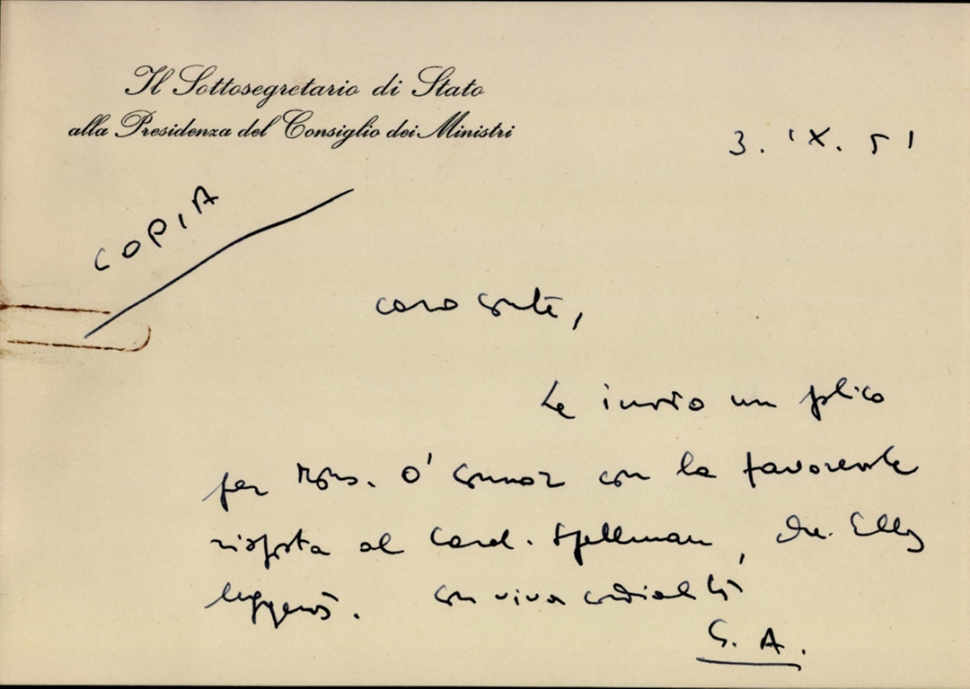 Giulio Andreotti invia a Enrico Pietro Galeazzi sui rapporti con i monsignori Francis Spellman e Martin John O'Connor. Manoscritto