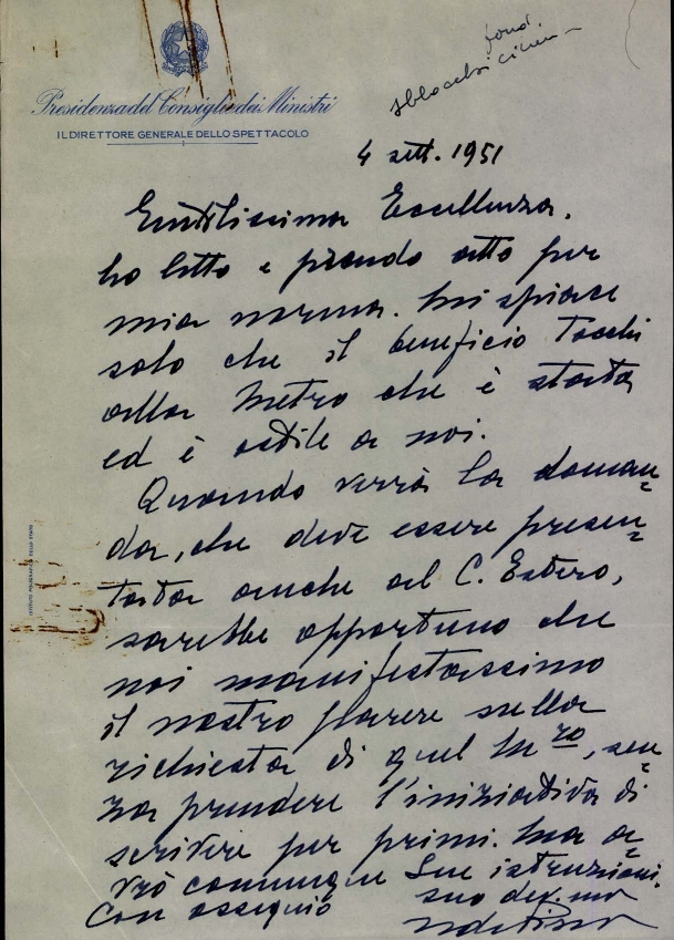 Lettera di Nicola De Pirro, direttore generale dello spettacolo, all'on. Giulio Andreotti, sottosegretario di Stato alla presidenza del consiglio dei ministri