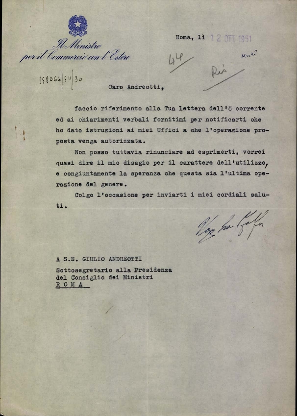 Lettera dell'on Ugo La Malfa, ministro per il commercio con l'estero, all'on. Giulio Andreotti, sottosegretario di Stato alla presidenza del consiglio dei ministri