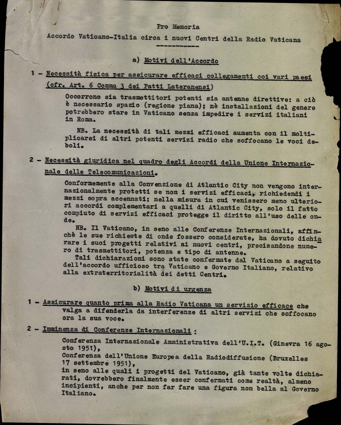 "Pro memoria accordo Vaticano-Italia circa i nuovi Centri della Radio Vaticana"