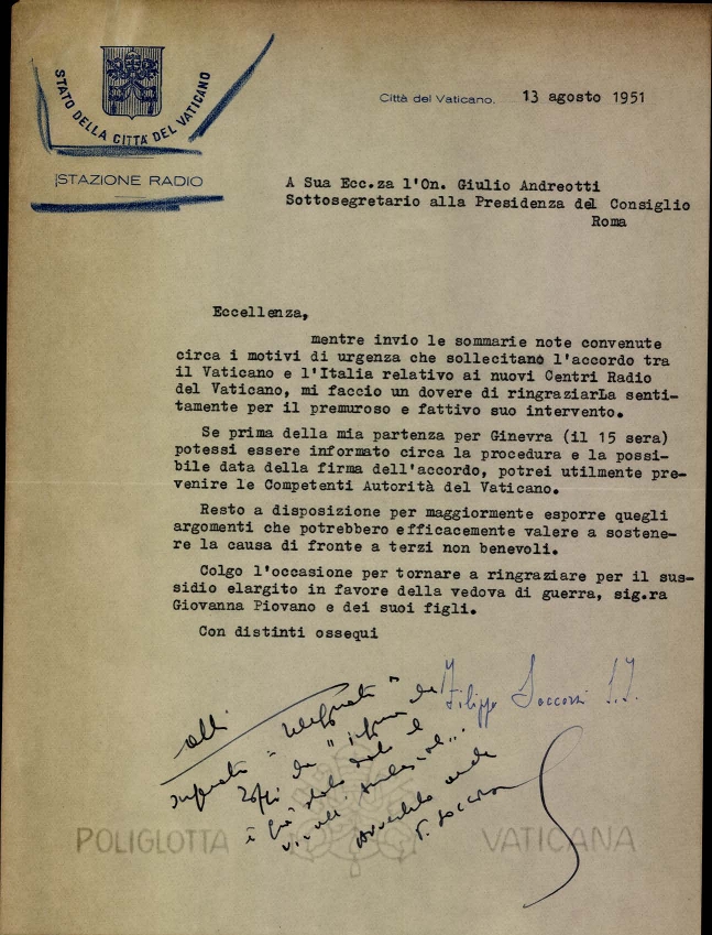 Lettera di padre Filippo Soccorsi, direttore della Radio Vaticana, all'on. Giulio Andreotti, sottosegretario di Stato alla presidenza del consiglio dei ministri