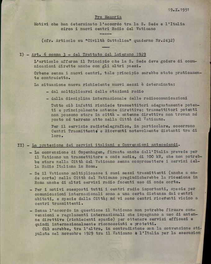 "Pro memoria. Motivi che han determinato l'accordo tra la S. Sede e l'Italia circa i nuovi centri Radio del Vaticano"