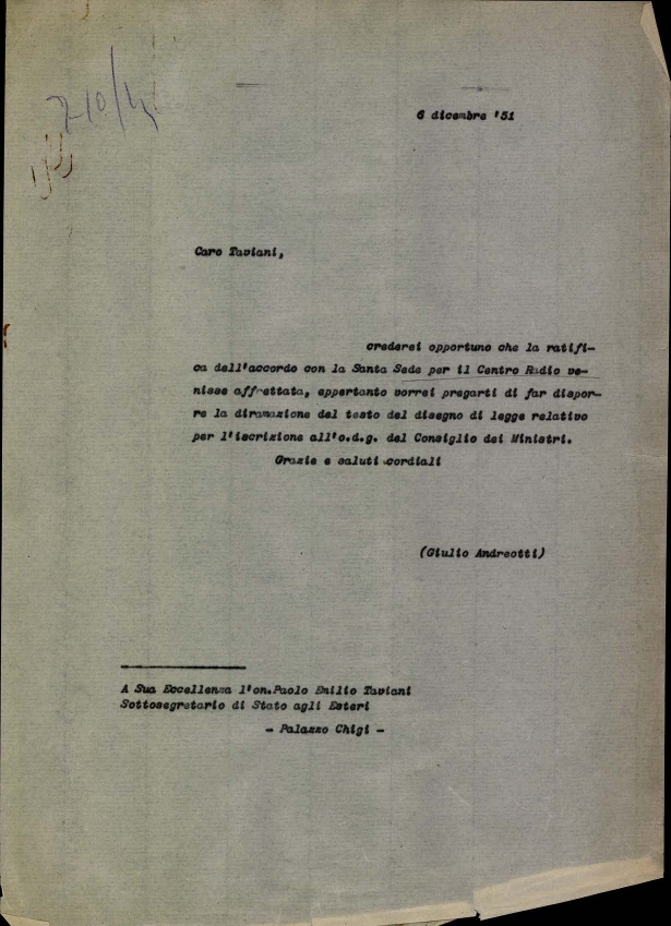 Giulio Andreotti chiede a Paolo Emilio Taviani di disporre con urgenza la diramazione del testo del disegno di legge relativo all'accordo con la Santa Sede per il Centro Radio. Dattiloscritto