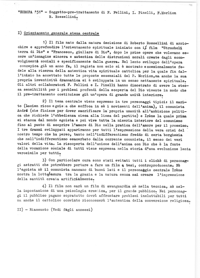 "Europa '51". Soggetto-pre-trattamento di F. Fellini, I. Pinelli, F. Morlion, R. Rossellini"