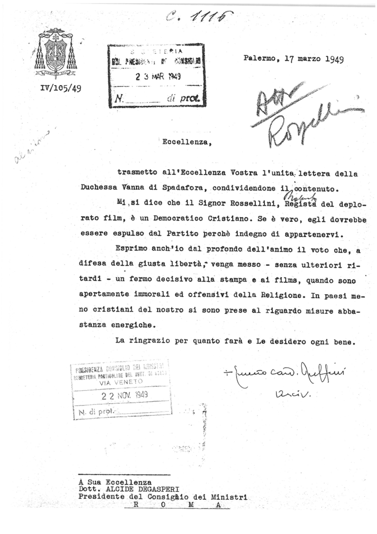 Mons. Ernesto Ruffini segnala ad Alcide De Gasperi l'immoralità del regista Roberto Rossellini e l'opportunità che egli venga espulso dalla DC. Dattiloscritto
