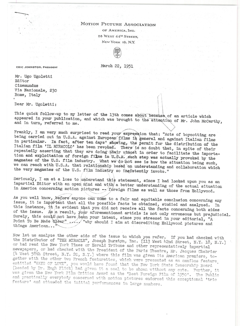Lettera di Bernard Kreisler, della Motion picture association, a Ugo Ugoletti, direttore di «Cinemundus»