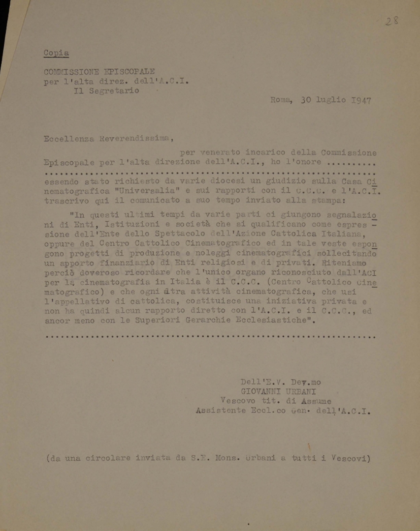 Mons. Giovanni Urbani ribadisce che l'unico organo riconosciuto dall'ACI per la cinematografia in Italia è il Centro cattolico cinematografico - CCC. Dattiloscritto