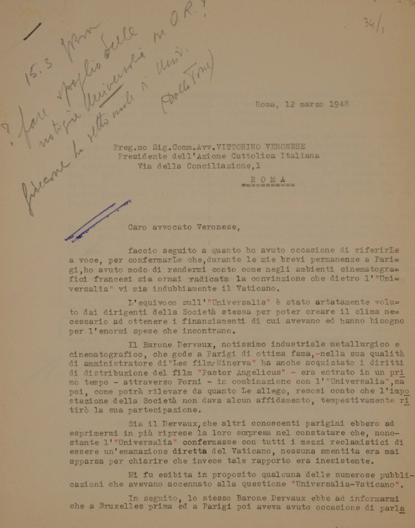 Antonio Scarano scrive a Vittorino Veronese per informarlo di quanto appreso negli ambienti della cinematografia cattolica francese sulla posizione della Universalia nei confronti del Vaticano. Dattiloscritto