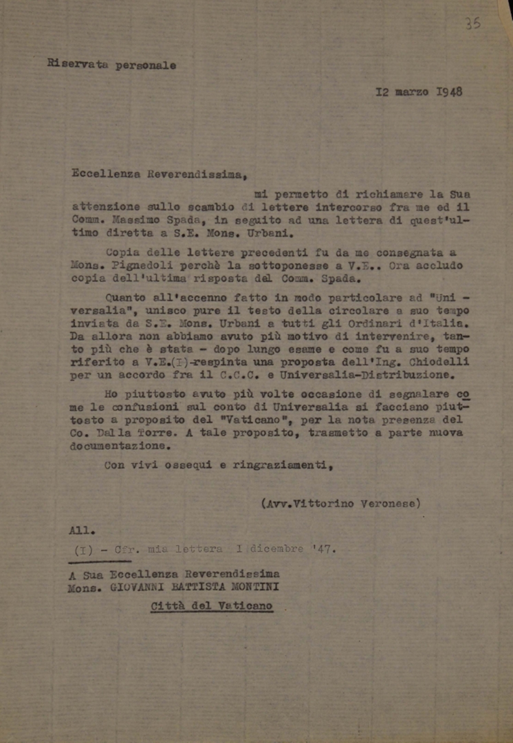 Vittorino Veronese riferisce a mons. Giovanni Battista Montini a proposito dei rapporti tra Universalia Film, il Centro cattolico cinematografico - CCC, Universalia Distribuzione e il Vaticano. Dattiloscritto