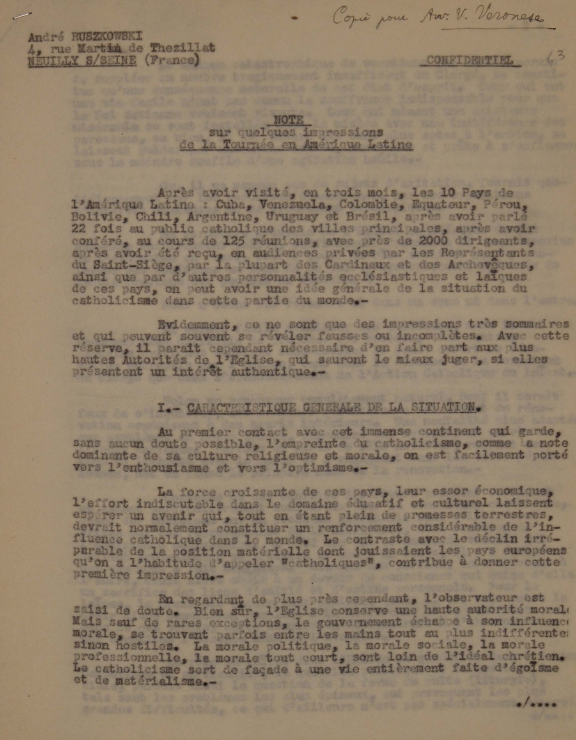 Relazione sulla situazione del cattolicesimo in America Latina. Dattiloscritto