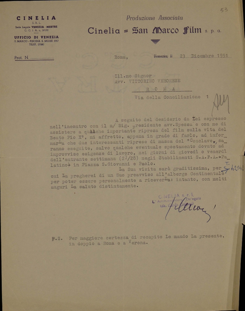Carlo Cecconi invita Vittorino Veronese ad assistere ad alcune riprese del film su Pio X. Dattiloscritto
