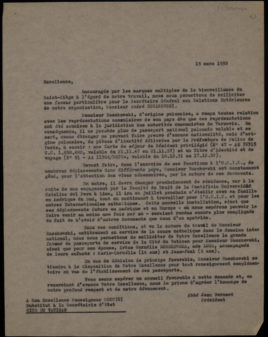 Jean Bernard chiede a mons. Giovanni Battista Montini un interessamento a favore di André Ruszkowski, ovvero il rilascio di un passaporto di servizio della Città del Vaticano che gli consenta di muoversi liberamente in diversi paesi per lo svolgimento dei suoi molteplici incarichi. Dattiloscritto