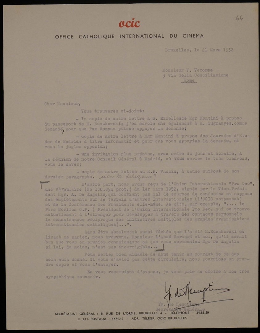 Lettera di Yvonne de Hemptinne, segretario generale dell'Office catholique international du cinematographe - OCIC, a Vittorino Veronese