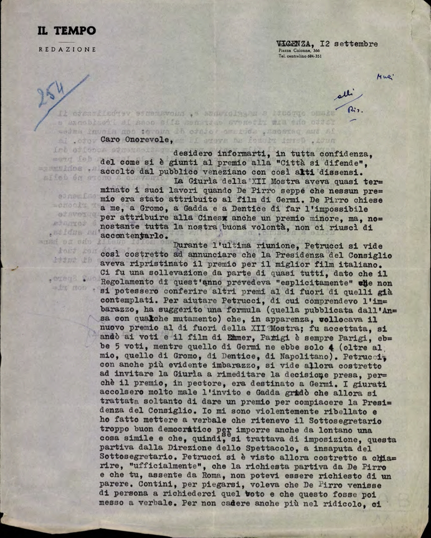 Lettera di Gian Luigi Rondi, su carta intestata al quotidiano Il Tempo, all'on. Giulio Andreotti, sottosegretario di Stato alla presidenza del consiglio dei ministri