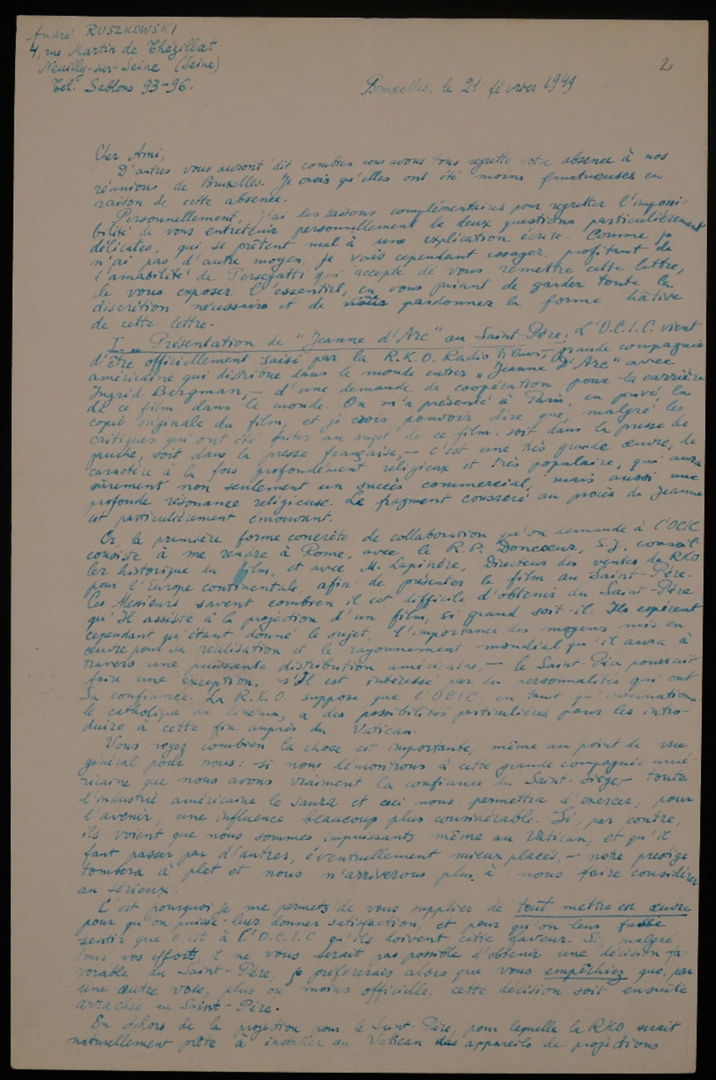 Osservazioni sulla presentazione del film "Jeanne d'Arc" al Santo Padre e sulla posizione dell'OCIC nei confronti della Santa Sede, del Centro cattolico cinematografico - CCC e della Confédération internationale du film - CIFR. Manoscritto