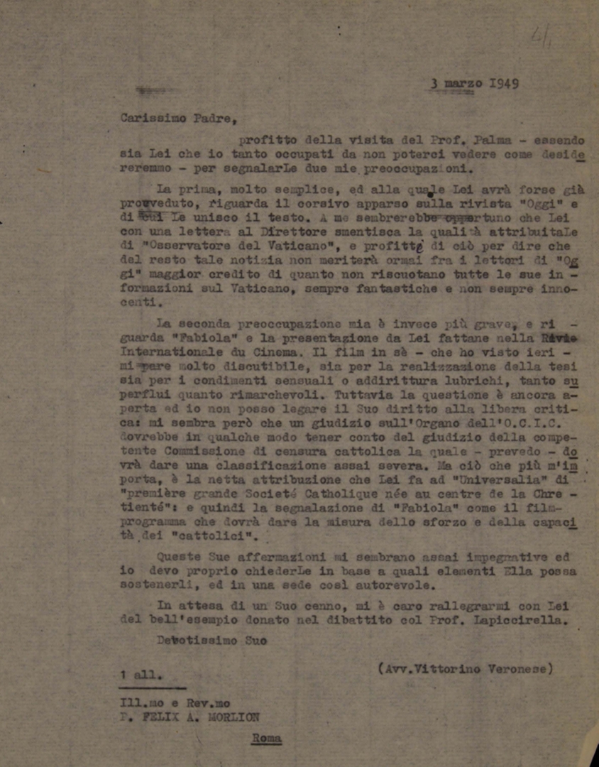 Vittorino Veronese scrive a padre Félix Morlion a proposito di alcune sue affermazioni ritenute discutibili, la prima relativa ai rapporti con il Vaticano, la seconda relativa alla classificazione del film "Fabiola". Dattiloscritto