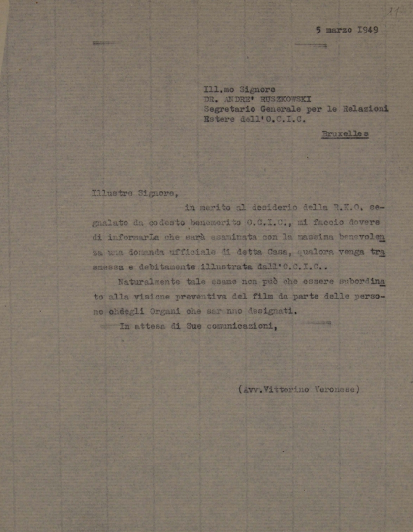 Lettera di Vittorino Veronese, presidente generale dell'ACI, ad André Ruszkowski, segretario generale per le relazioni estere dell'Office catholique international du cinematographe - OCIC
